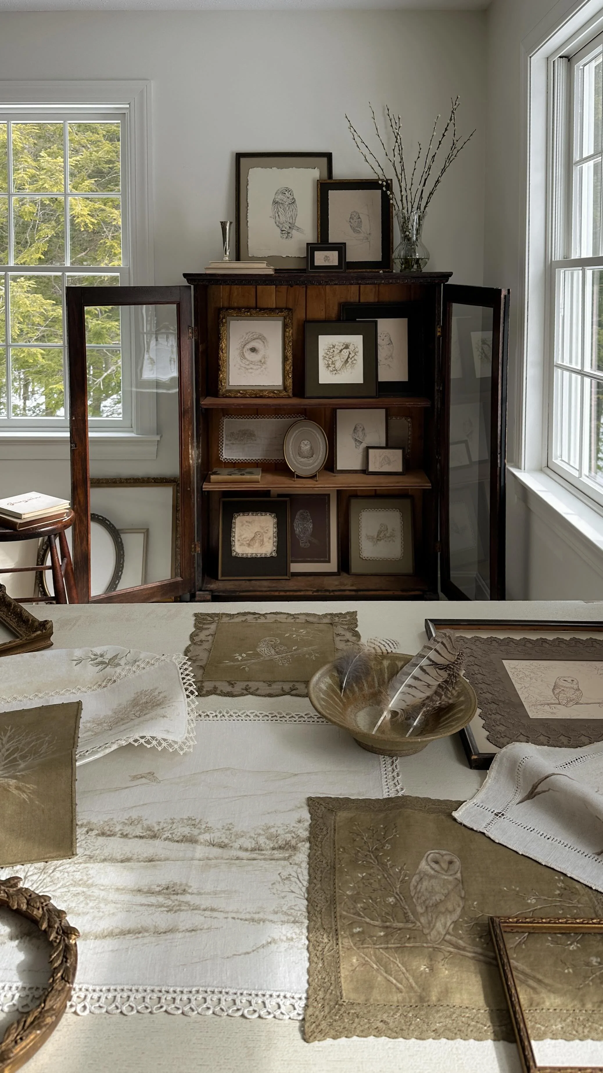 That way of noticing carried into this collection. It appears in darker grounds, pale papers, and vintage textiles where images soften and recede. Many of the works are drawn on delicate linens, softened by time with their original lacework intact. In a sense, they reflect a way of moving through thresholds that is gradual and gentle.