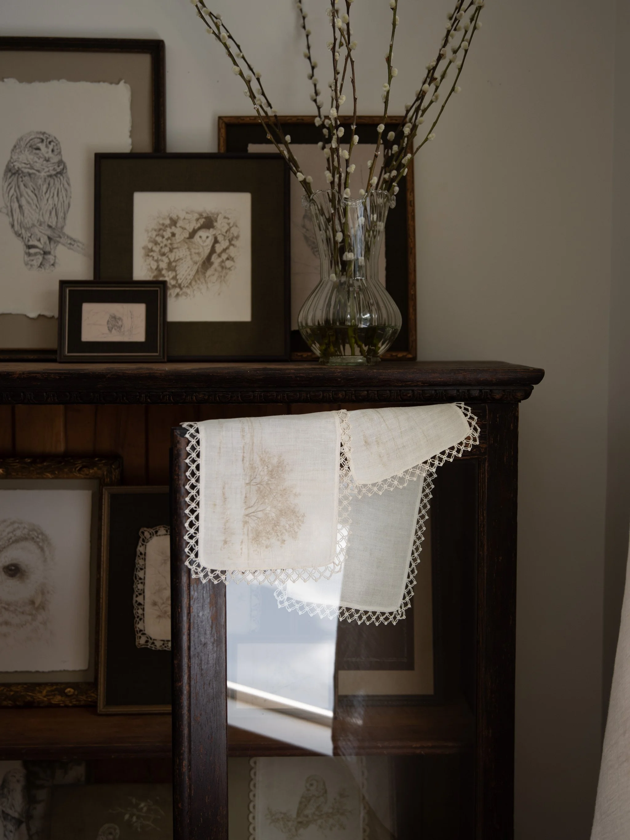 That way of noticing carried into this collection. It appears in darker grounds, pale papers, and vintage textiles where images soften and recede. Many of the works are drawn on delicate linens, softened by time with their original lacework intact. In a sense, they reflect a way of moving through thresholds that is gradual and gentle.